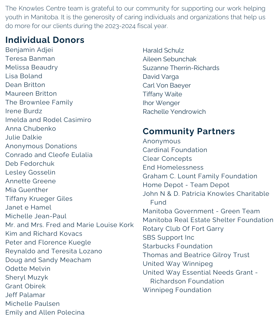 The Knowles Centre team is grateful to our community for supporting our work helping youth in Manitoba. It is the generosity of caring individuals and organizations that help us do more for our clients.